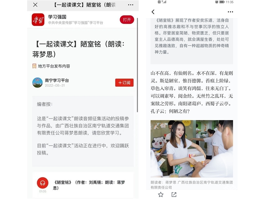 軌道地產(chǎn)商業(yè)公司黨支部蔣夢(mèng)思同志參加了此次活動(dòng),她朗讀的作品《陋室銘》經(jīng)南寧軌道交通集團(tuán)推選,榮登“學(xué)習(xí)強(qiáng)國”平臺(tái),在“一起讀課文”欄目展播。