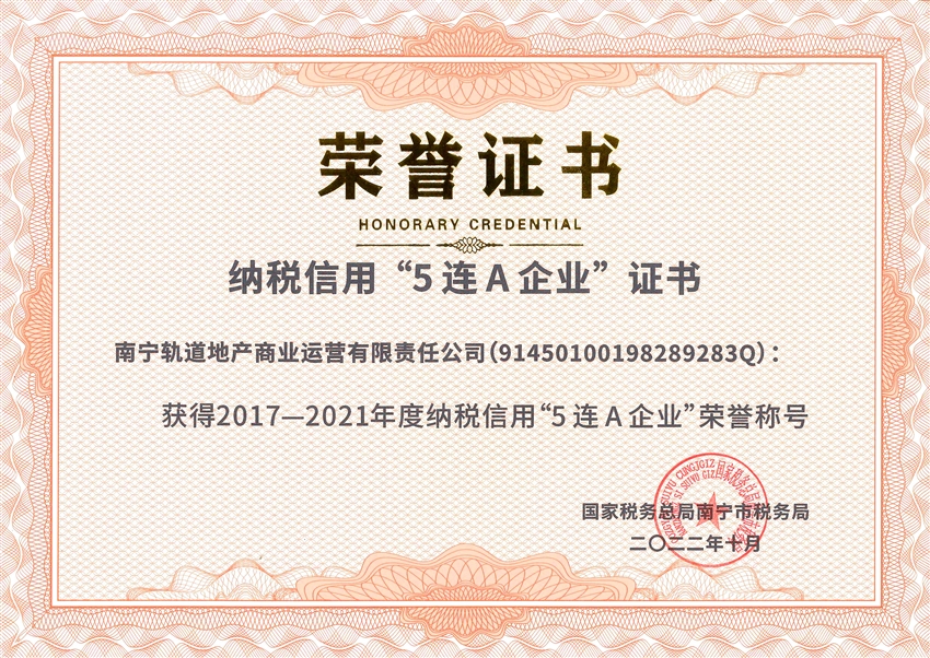 【喜報(bào)】誠信納稅 守法經(jīng)營!軌道地產(chǎn)商業(yè)公司榮獲納稅信用“5連A”企業(yè)榮譽(yù)