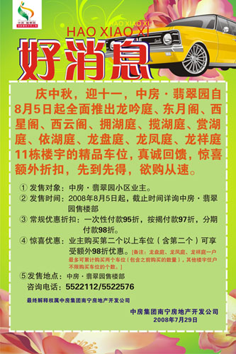 2、發(fā)售時(shí)間:2008年8月5日起,截止時(shí)間詳詢中房·翡翠園售樓部