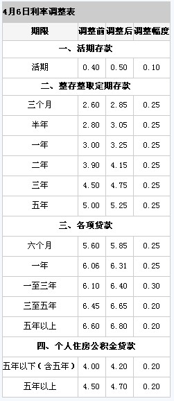 中國人民銀行決定,自2011年4月6日起上調金融機構人民幣存貸款基準利率。金融機構一年期存貸款基準利率分別上調0.25個百分點,其他各檔次存貸款基準利率及個人住房公積金貸款利率相應調整(見附表)。